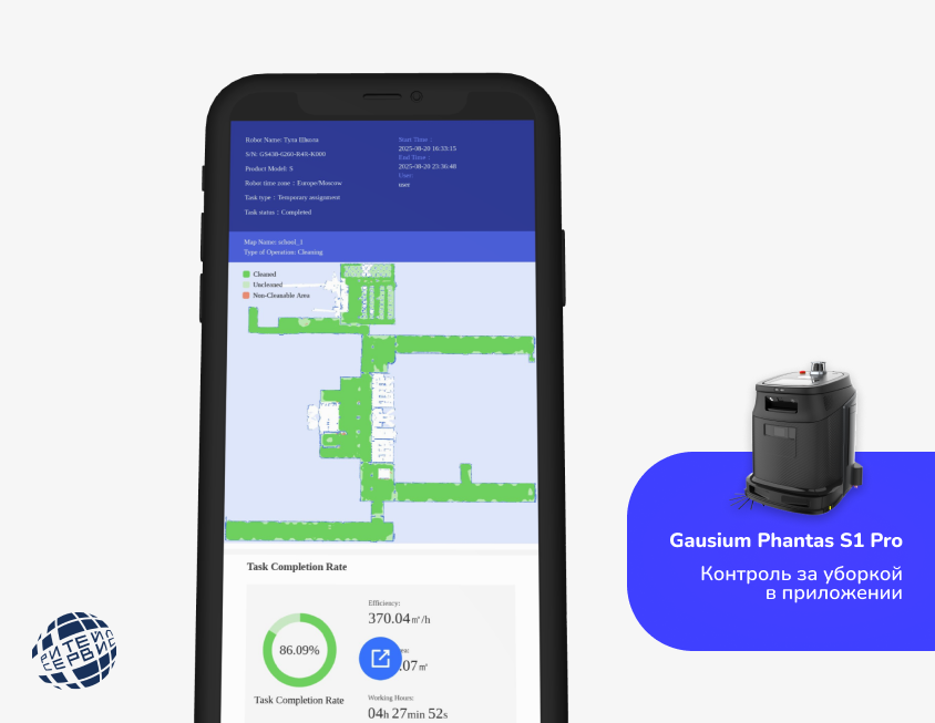 Для решения поставленных задач был выбран робот-уборщик Gausium Phantas S1 Pro — универсальное устройство, сочетающее в себе функции пылесоса, моечной машины, подметания и вытирания пыли. Основные преимущества: